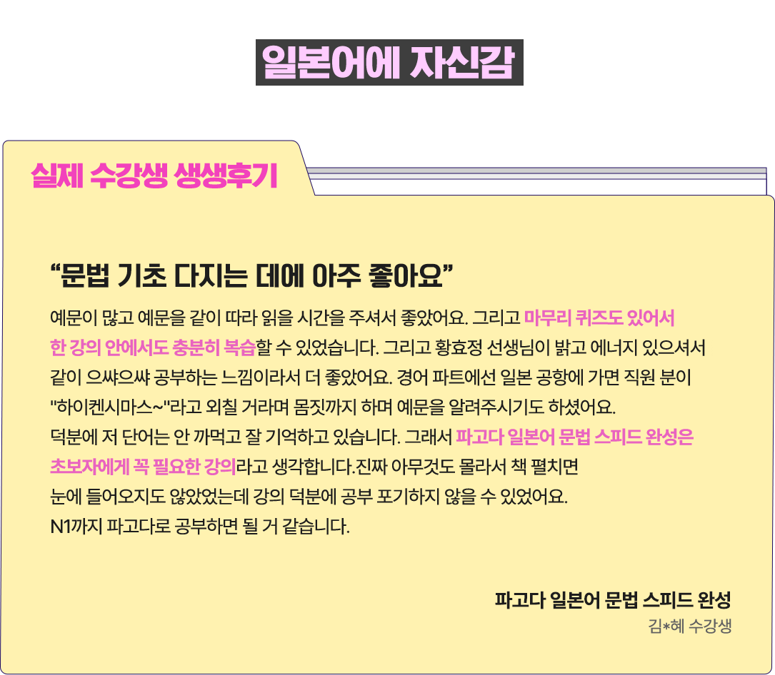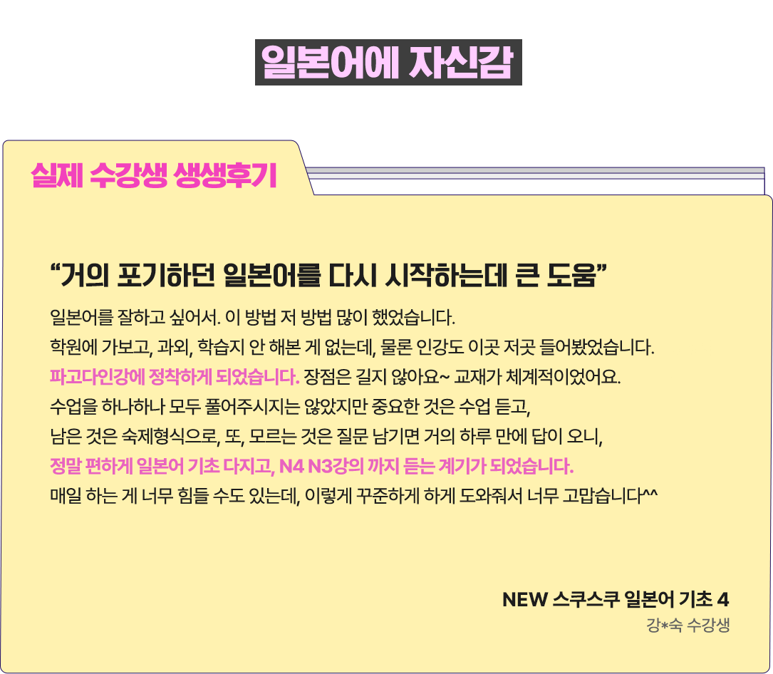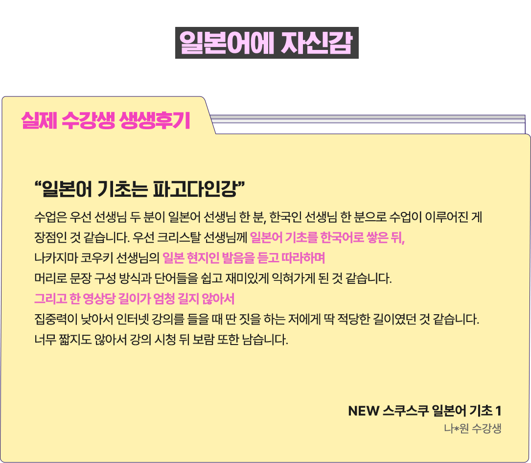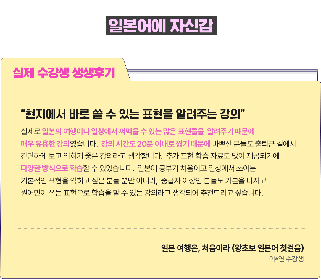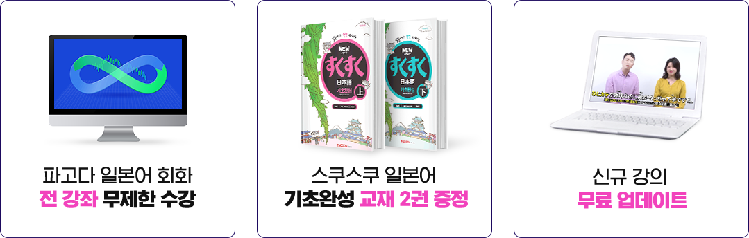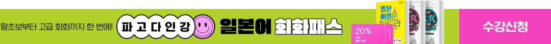 - 파고다 일본어 왕기초 회화패스 상품 구매 후, 수강 종료 일주일 전 일본어 전 강좌 패스 20% 할인 쿠폰이 제공됩니다.