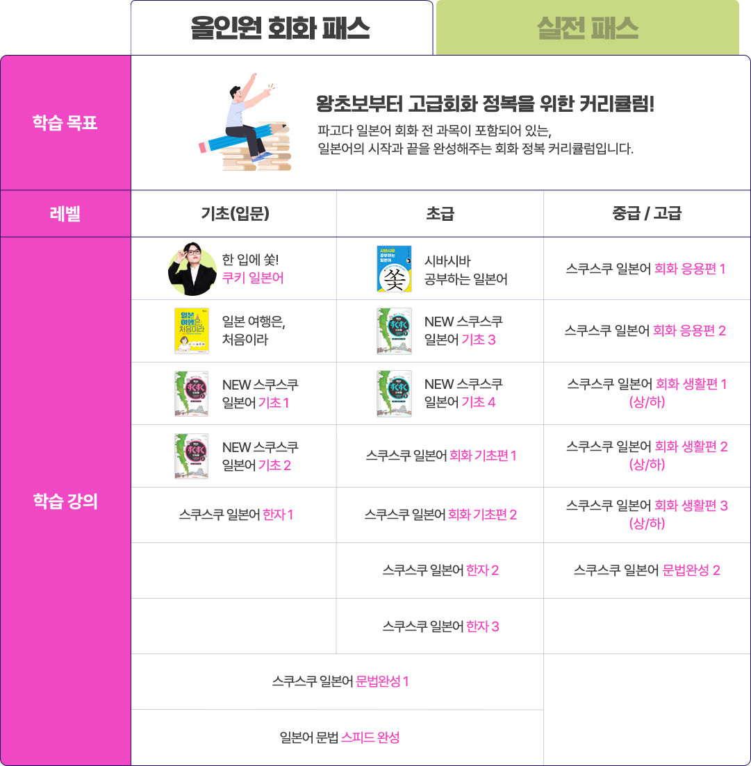 - 파고다 일본어 올인원 회화패스는 파고다 일본어 회화 전 강의를 수강하실 수 있는 슈퍼패스 상품으로, 구매 시 스쿠스쿠 일본어 기초완성 上,下 교재가 제공됩니다.