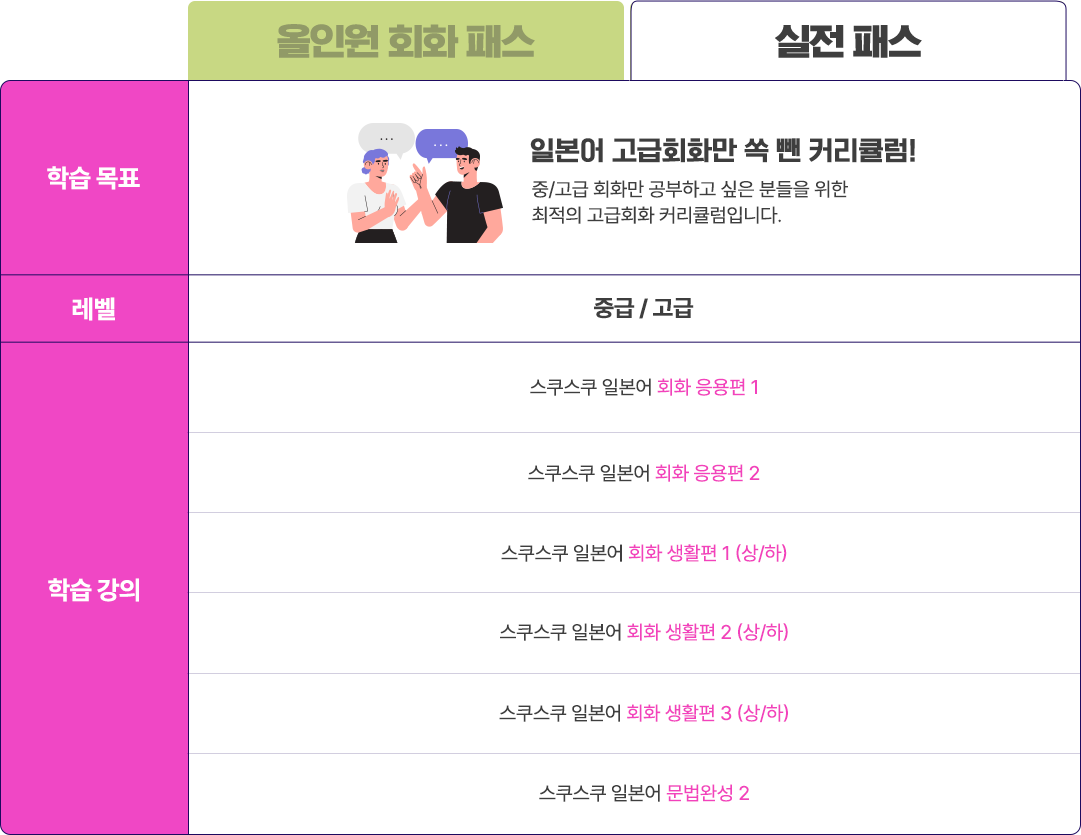 - 파고다 일본어 실전 회화패스 상품 구매 후, 수강 종료 일주일 전 일본어 전 강좌 패스 20% 할인 쿠폰이 제공됩니다.