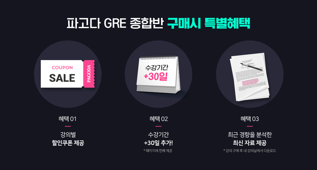 - GRE 종합반 구매 시 내 강의실에서 [GRE 고득점을 위한 필수어휘 모음집], [빈출 토픽 & 샘플 에세이 20선 자료집] 자료 다운이 가능합니다.