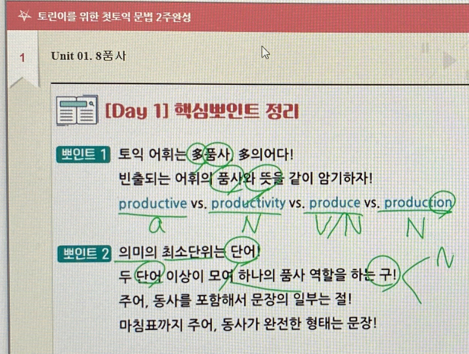 토익을 시작하고 사실 제대로 문법을 공부한 적이 없었습니다. 문법 공부가 너무 싫었거든요... 적어도 한 번은 문법을 처음부터 차근차근 공부해야 한다는 걸 아는데도 공부를 하려하면 너무 하기 싫고 지루해서 문제를 풀면서 해석을 보는 식으로만 공부했어요. 그러니까 제대로 성적이 절대 안나오더라구요. 그래서 하기 싫은 마음을 참고 강의를 듣기로 했습니다. 처음부터 차근차근 알려주는 강의가 필요하다는 것을 너무 늦게 알았어요.